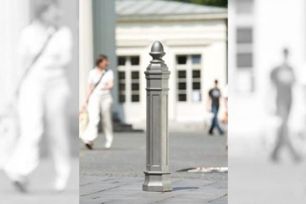 Borne à structures multiples en fonte d‘aluminium sur plan hexagonal dont la forme se termine en s’affinant par une figure qui a la forme d’un gland. Les six côtés comprennent des empreintes carrées. En option, ce modèle peut être à sceller dans du béton